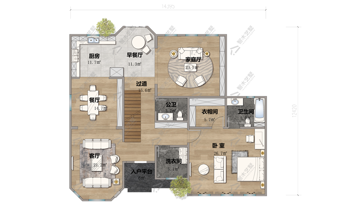 别墅户型设计上体现了对长者的细致关怀,在一楼南向为父母精心规划的“适老生活区域”,避免了上下楼梯的不便,配备独立卫浴、浴缸及衣帽间。