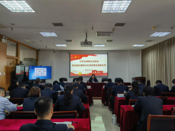 2026年3月27日,河北银行廊坊分行党委书记紧扣金融行业发展规律与廊坊分行经营实际,从以坚定理想信念奋进河北银行廊坊分行高质量发展新征程为主题,为分行全体党员干部讲授专题党课,引导全体人员以坚定信仰锚定发展方向,以实干担当破解发展难题,推动分行各项工作提质增效、行稳致远。